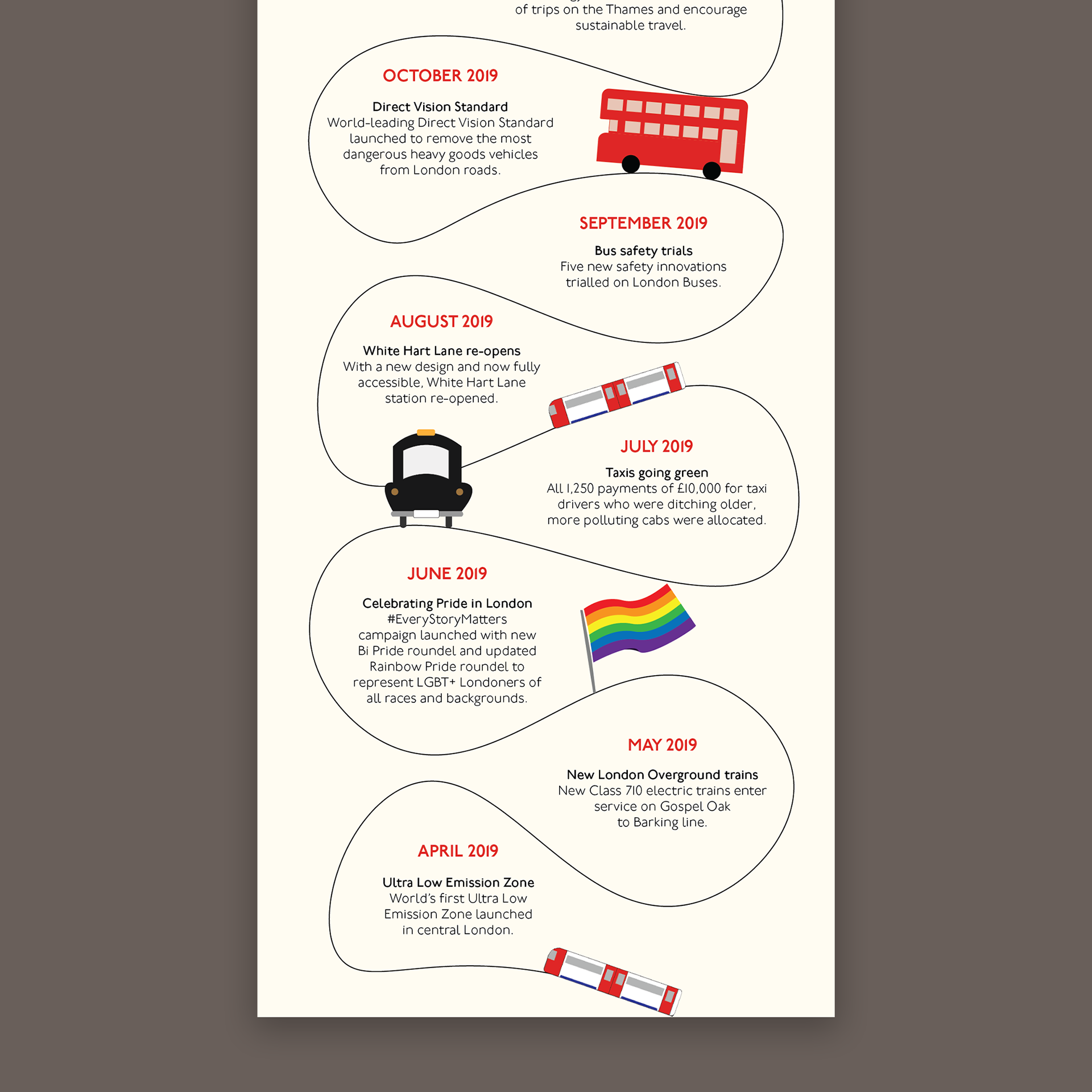 Redesigned an illustrated infographic for the Transport of London. TFL's achievements from April 2019 - March 2020 are all taken from their official Annual Report.